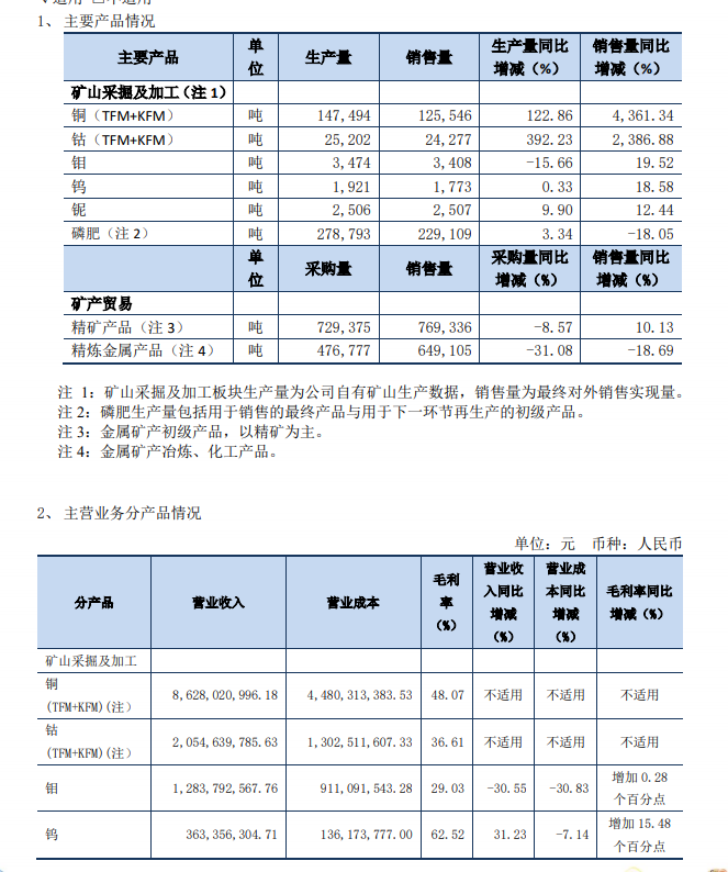 公司鉬、鎢、鈮、磷肥的產(chǎn)量分別為3474噸、1921噸、2506噸和27.88萬噸,保持穩(wěn)定或同比增長。一季度公司銅銷量為12.55萬噸,同比增長43.61倍;鈷銷量2.43萬噸,同比增長23.87倍;鉬、鎢、鈮的銷量分別為3408噸、1773噸、2507噸,同比分別增長19.52%、18.58%和12.44%;在貿(mào)易端,公司精礦產(chǎn)品銷量為76.93萬噸,精煉金屬產(chǎn)品銷量為64.91萬噸。
