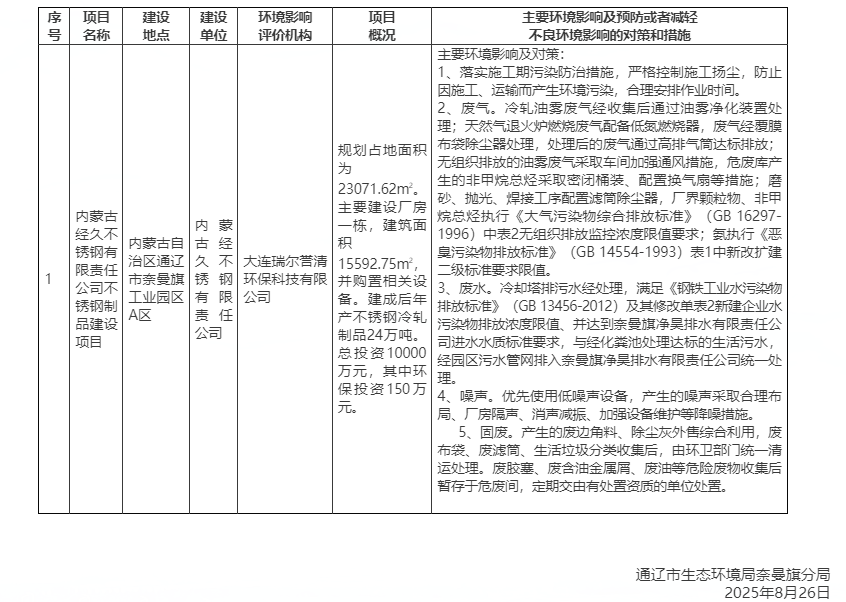 8月26日,通遼市生態(tài)環(huán)境局奈曼旗分局發(fā)布了《關(guān)于內(nèi)蒙古經(jīng)久不銹鋼有限責(zé)任公司不銹鋼制品建設(shè)項(xiàng)目(報(bào)告表)擬審批公示》。